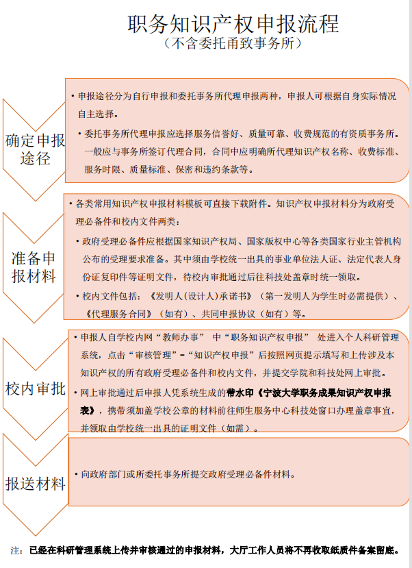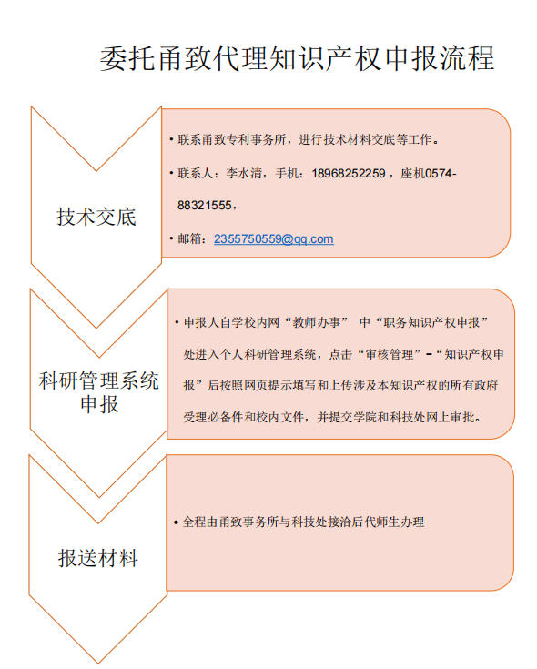 (3)凡选择宁波甬致专利代理有限公司进行代理申报的各类知识产权,自科研管理系统审核通过以后,所有知识产权申报材料盖章(包括盖校章)、报送国家有关部门、材料归档等事宜皆由甬致专利代理有限公司与科技处接洽后代为办理,实现师生跑零次。具体办事流程见附件图。