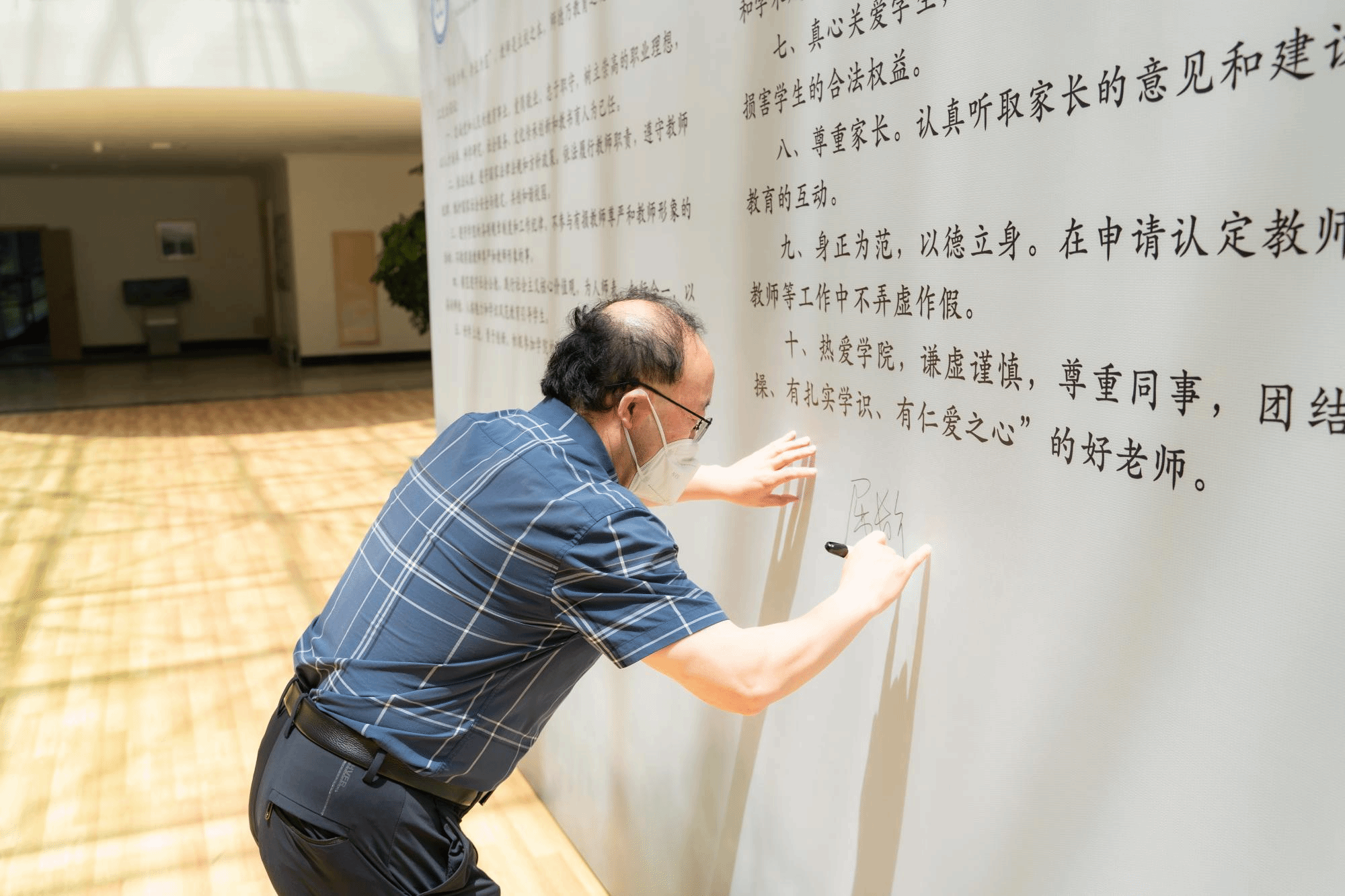 会上,全体参会人员观看了教育部最新公开曝光的第十二批7起违反教师职业行为十项准则典型案例警示教育片, 并共同签署了师德师风承诺书,承诺自觉落实立德树人根本任务,做“四有”好老师,时刻做到自重、自省、自警、自励,始终坚守师德底线,营造风清气正的育人环境。