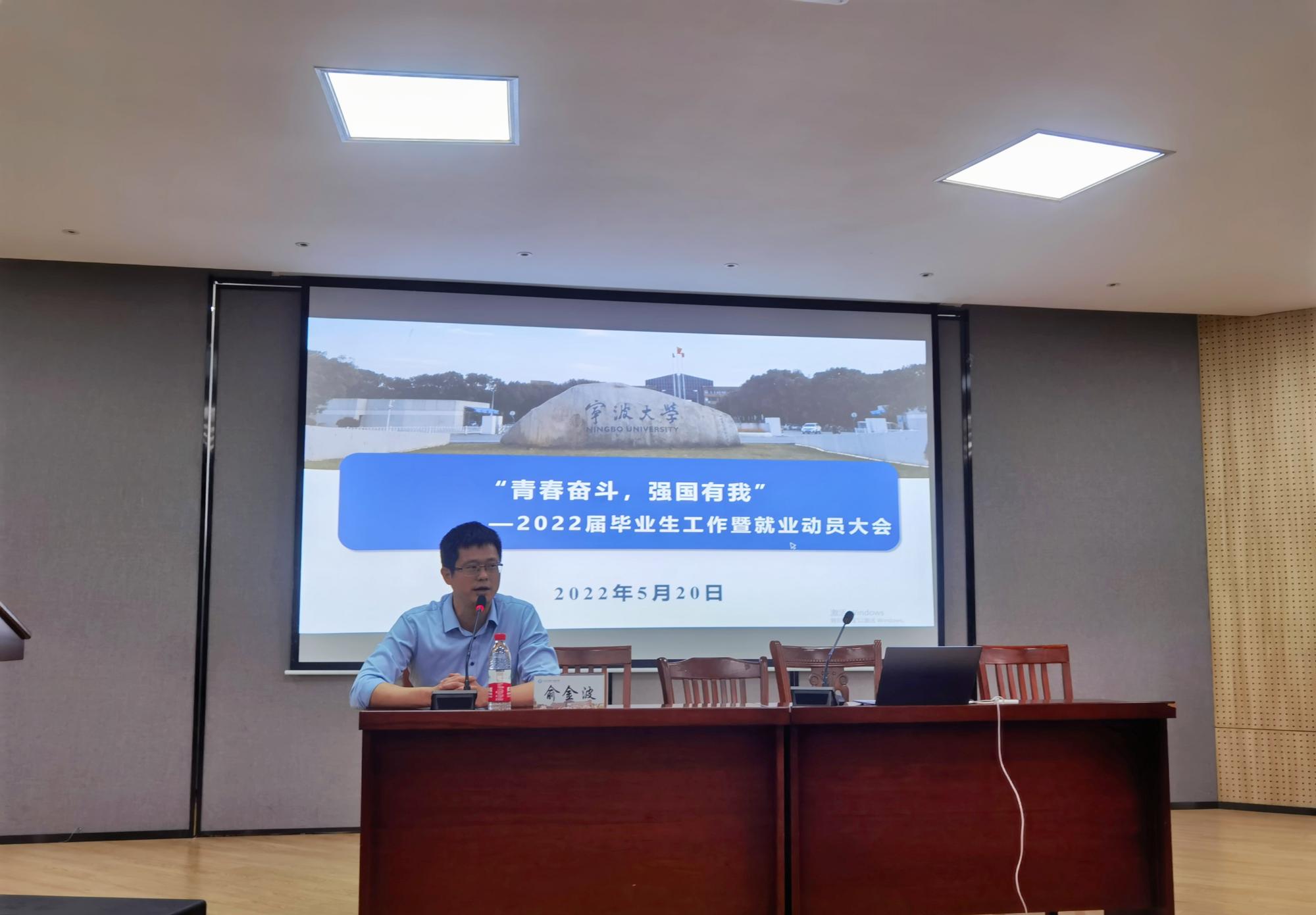 为全面推进落实我院毕业生工作,为毕业生提供全面的就业服务,5月20日下午,我院在113报告厅开展“青春奋斗、强国有我”—2022届毕业生工作暨就业动员大会,国产自拍党委书记俞金波、党委副书记姜萍、学工办主任张宾、团委书记陈佳雯、特邀杰出校友企业家厉刚出席本次会议,全体2022届毕业生共同参会。