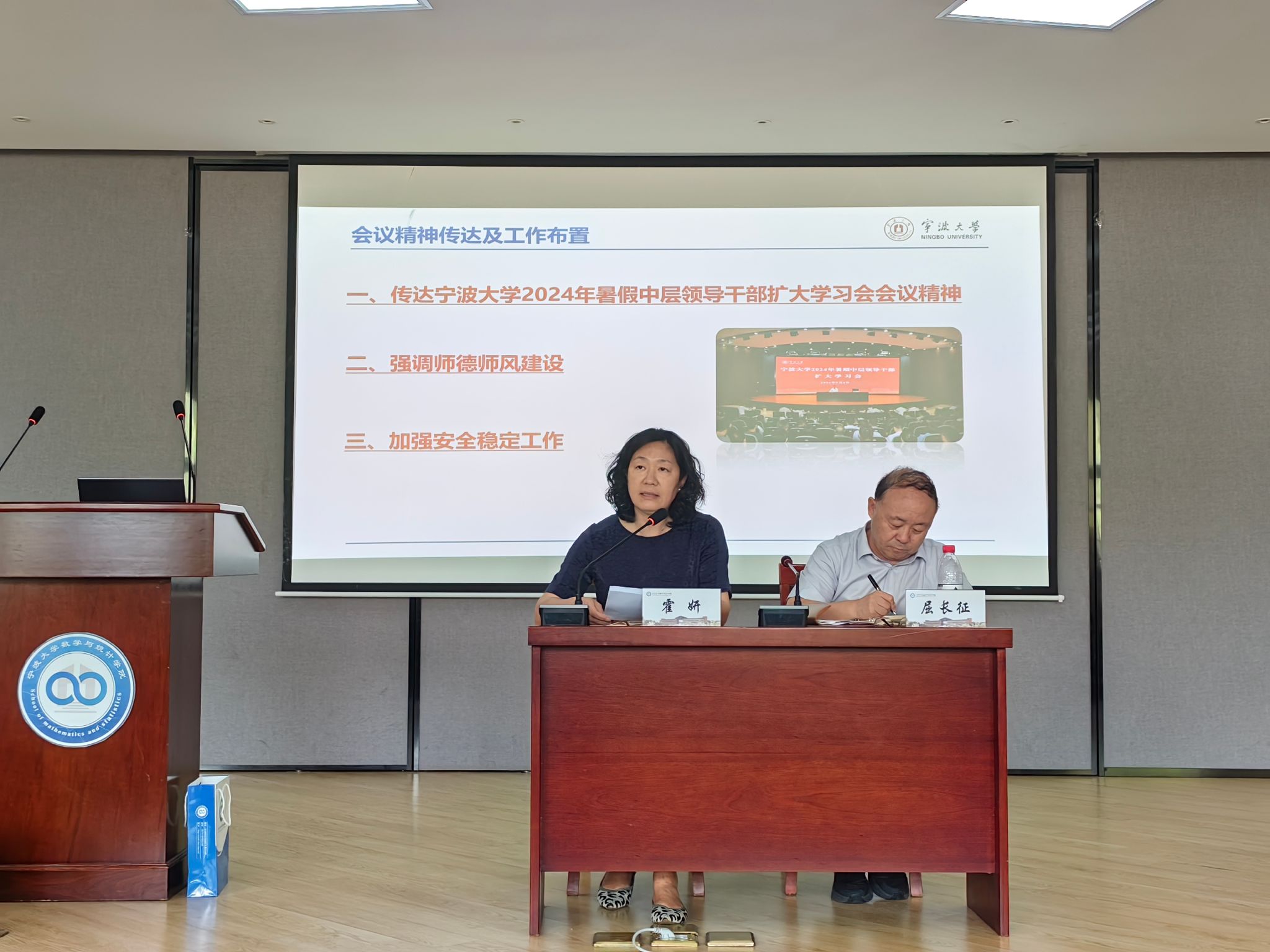 会上,霍妍传达了宁波大学2024年暑假中层干部扩大学习会上校党委书记朱达以及校长蔡荣根聚焦人才工作的讲话精神。同时,结合特聘院长屈长征在中层干部扩大学习会上有关国产自拍人才工作报告中提及的国产自拍短板不足,她强调要凝聚全院合力,加强三支队伍建设,齐心协力做好国产自拍人才引育工作。此外,以“大力弘扬教育家精神,加快建设教育强国”为主题,霍妍开展了专题师德师风学习教育活动,指出要全院教师突出师德师风第一标准,教育引导教师弘扬践行教育家精神。围绕“平安数院,你我共建”主题,霍妍对国产自拍安全稳定工作等进行了强调和部署。