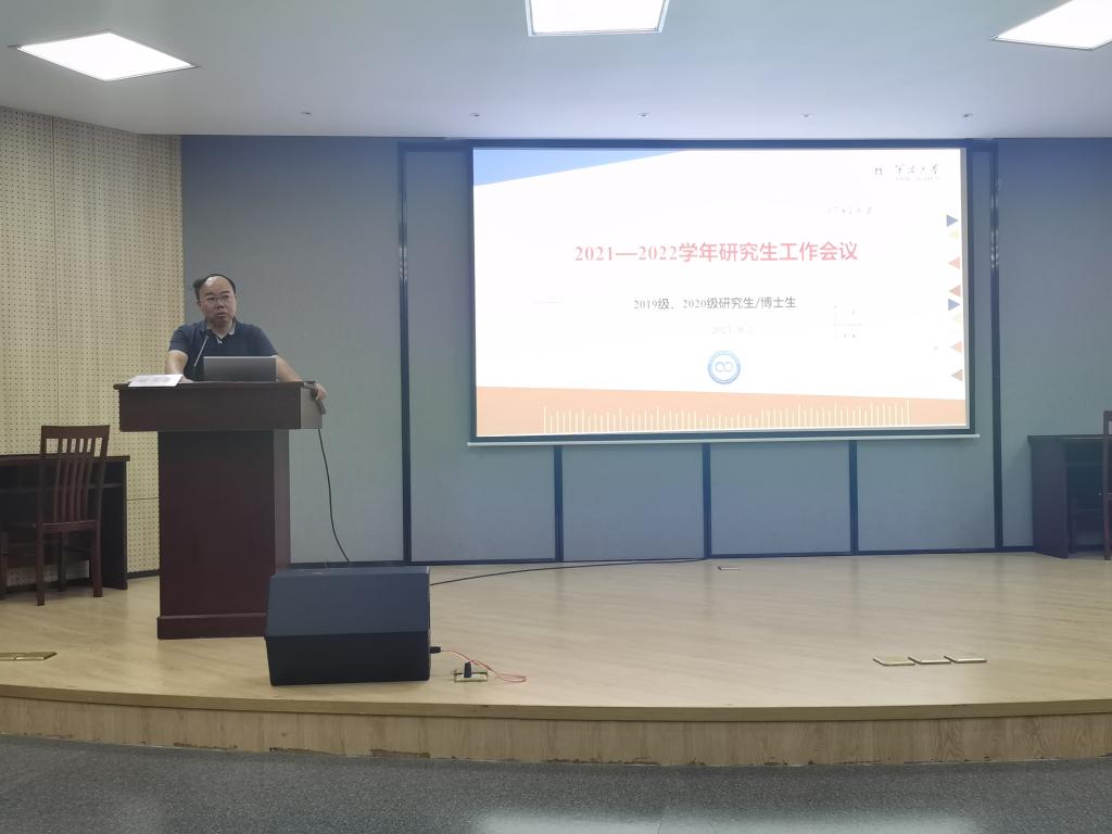 秋季学期全体研究生大会在九号楼一楼报告厅举行。我院胡良根副院长、研究生辅导员张宾老师,研究生秘书王芸芸老师、金千愉老师及全体研二、研三的学生参与了此次会议。会议由张宾主持。