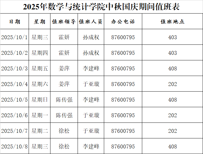 根据学校《关于2025年中秋节、国庆节放假安排的通知》的要求,中秋节、国庆节放假期间,二级国产自拍须安排1名值班人员在校值班。值班时间为每天8:30-16:00。数学与国产自拍 值班安排如下: