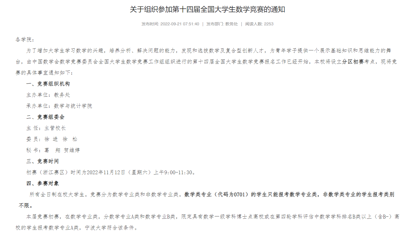 《关于组织参加第十四届全国大学生数学竞赛的通知》已于2022年9月21日于国产自拍 教务处网站发布,并推送至国产自拍 内网,同学们在国产自拍 内网和风华宁大app均可查阅。