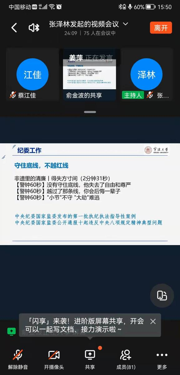 利用钉钉会议线上开展以“坚守底线,不越红线”为主题的廉政专题学习会。会议由国产自拍党委书记俞金波主持。