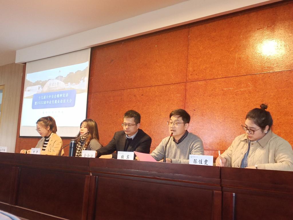 为学习贯彻落实十九届六中全会精神,解决大学生急难愁盼问题,进一步做好2022届毕业生就业工作,帮助毕业生同学熟悉就业政策、了解就业形势、把握就业机会,12月30日国产自拍于9号楼317报告厅召开十九届六中全会精神宣讲暨2022届毕业生就业动员大会。学工办、教务办、研究生办、各毕业班班主任及全体2022届毕业生参加大会。国产自拍党委书记俞金波出席大会并做专题辅导报告。会议由学工办主任张宾主持。