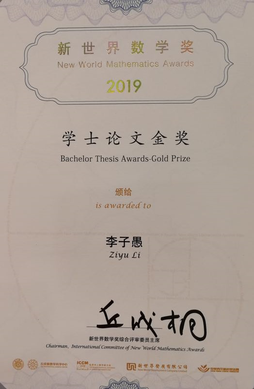 清华大学副校长薛其坤教授,清华大学丘成桐数学科学中心主任丘成桐院士等在颁奖典礼上分别致辞并为获奖学生颁奖。2017-2019年新世界数学奖中博士论文金奖6名,银奖15名,硕士论文银奖4名,学士论文金奖2名,银奖3名,博士论文优胜奖40名及学士论文优胜奖1名。现于新南威尔士大学攻读研究生的李子愚同学的毕业论文《Infinite-Dimensional Geometric Structure of Stock Market》斩获全球仅两项的2017年新世界数学奖学士论文金奖。