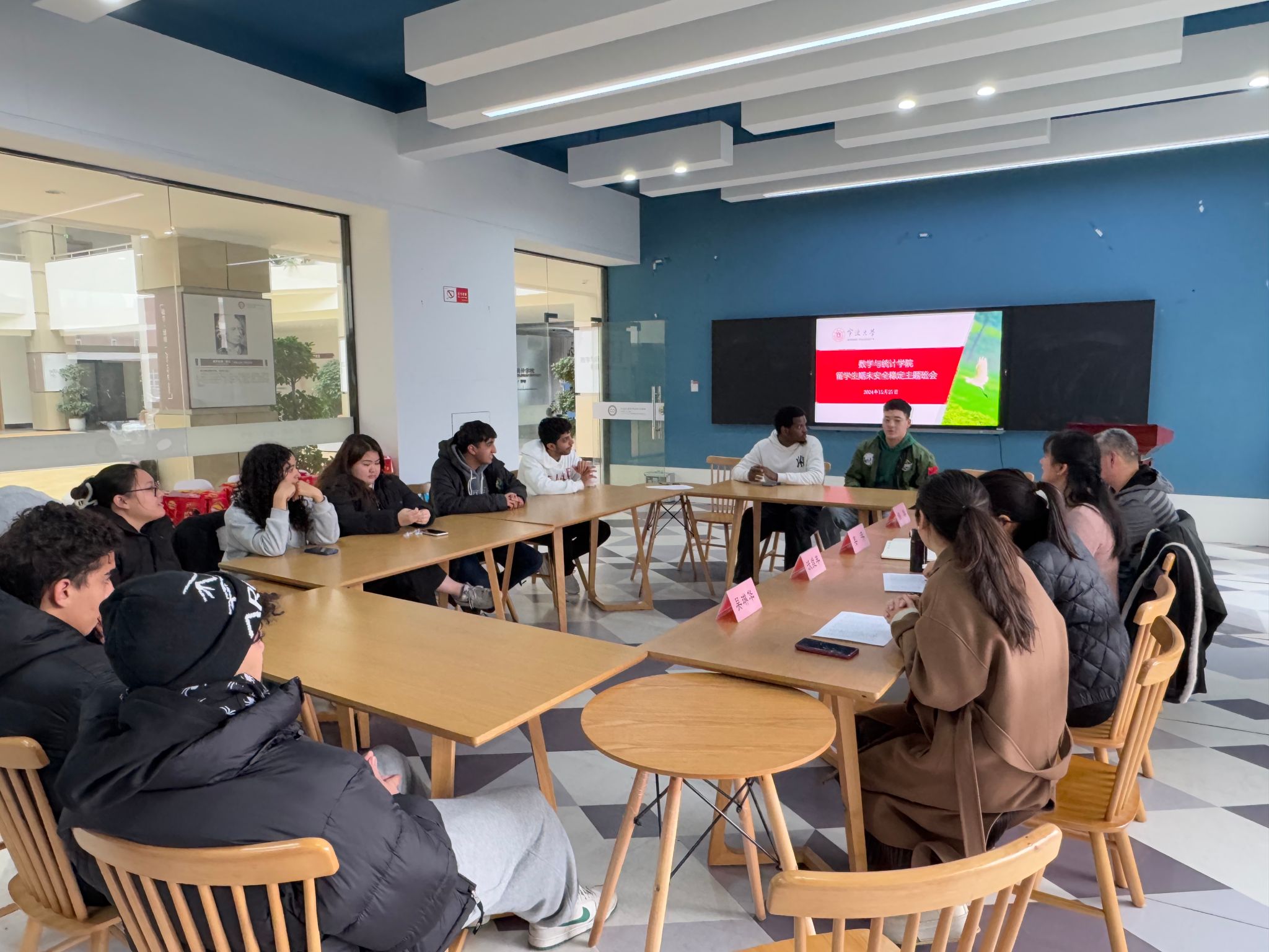 开展了留学生期末安全稳定主题班会,国产自拍党委副书记姜萍、学工办主任吴琳华、留学生班主任沃维丰、缪群以及13位留学生共同出席了此次主题班会。国产自拍围绕交通安全、校内外住宿须知、出行请假销假、严禁“三非”等主题进行了安全警示教育,同时,围绕期末和假期事项做了提醒和工作布置,旨在加强留学生管理,确保期末及寒假期间的安全稳定。