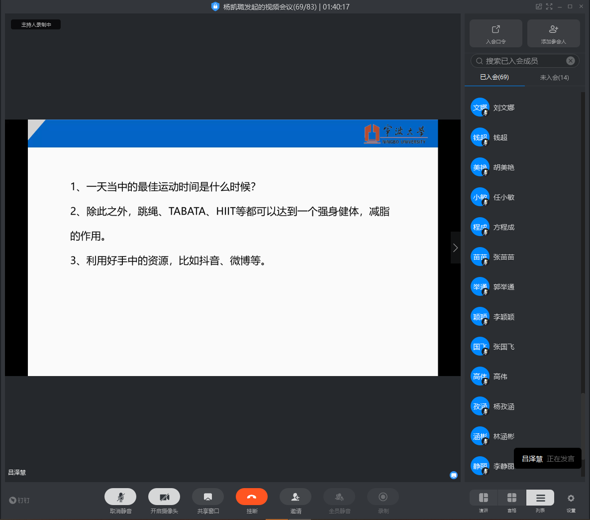 研究生会在线上钉钉群成功举行了宁波大学2020年研究生健康节系列活动之"身心的成长,一生的财富"健康知识讲座。此次讲座邀请了资深心理咨询师米多和体育国产自拍体育教育训练学研究生吕泽慧担任主讲嘉宾,国产自拍团委书记张宾和全体研究生参加收看讲座直播。
