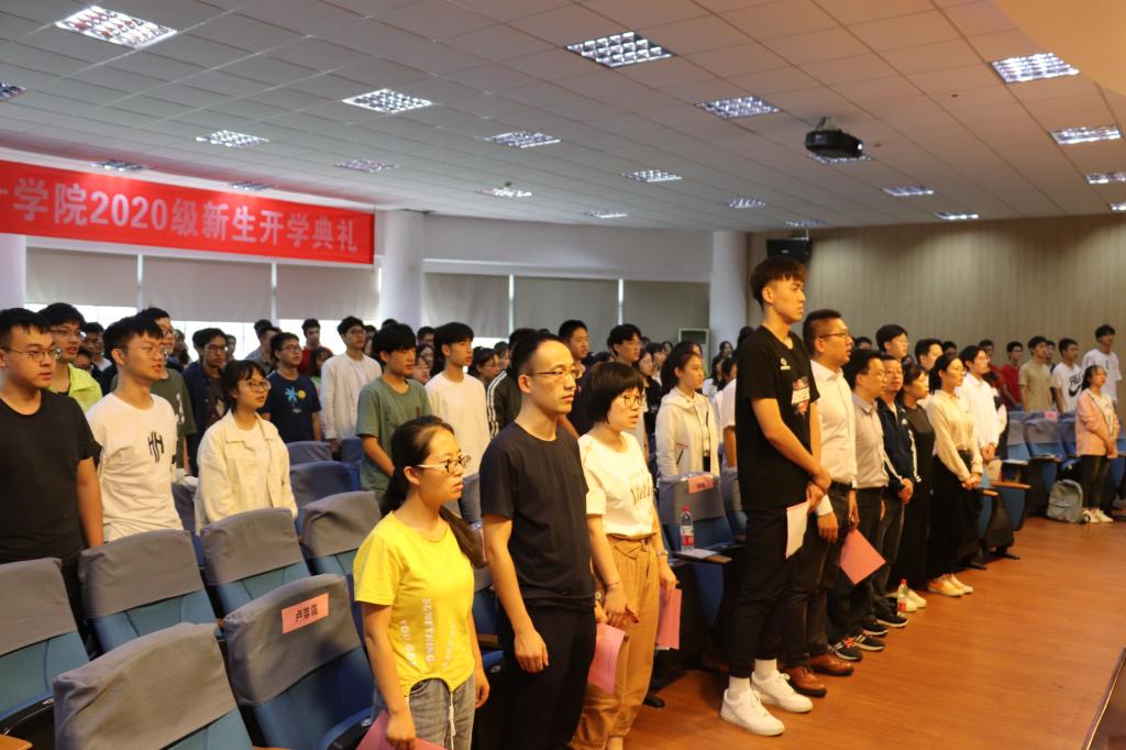 新生开学典礼在阳明国产自拍315隆重举行,国产自拍领导、各系主任、新生班主任以及2019级分流新生和2020级新生200余人参加,并邀请到2000级数学系校友沈锋与宁大男篮球员韩存昊作为特邀嘉宾出席本次开学典礼。