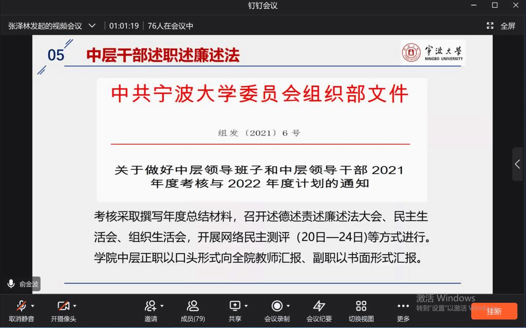 2021年12月14日,因受到疫情影响,学院通过钉钉会议的形式召开2021年最后一次全院大会。会议由院党委书记俞金波主持,学院70余名教职工参加本次会议。