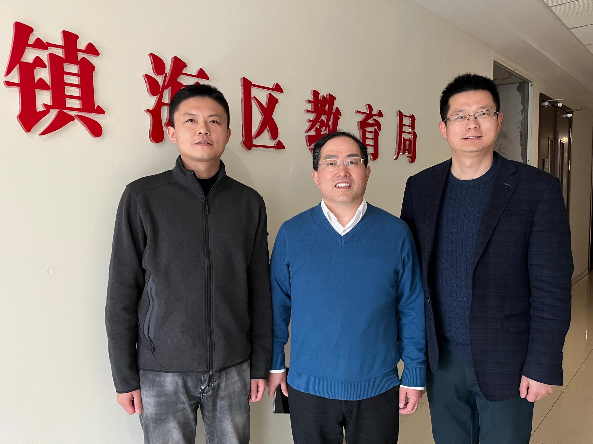 党委书记俞金波协同数学01级校友周凯走访数学85级校友,镇海区教育局党委书记毛志挺。