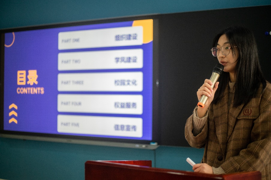 此外,团委、学生会、青协三个学生组织分别围绕工作特色做法展开述职。其中,团委提出四有工作思路,突出团组织的“三力一度”,创新工作模式,致力于将团组织的引领力、组织力、服务力遍布青年身边;学生会围绕“组织建设、学风建设、校园文化、权益服务、信息宣传”五个模块,着力打造赋能型学生会;青协提出“一二三四”工作法,努力贯彻学院“奉献、友爱、互助、进步”的志愿精神,引导学生内化于心,外化于行。
