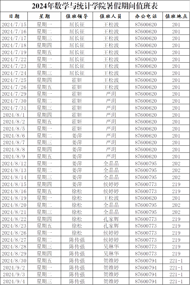 根据 “宁波大学校长办公室关于2024年暑期轮休及工作安排的通知”的要求,要根据“不误办事”的原则,安排好假期值班人员,确保周一至周五每天有人值班,值班时间为每天8:30-16:00。数学与国产自拍 2024年暑期值班安排如下: